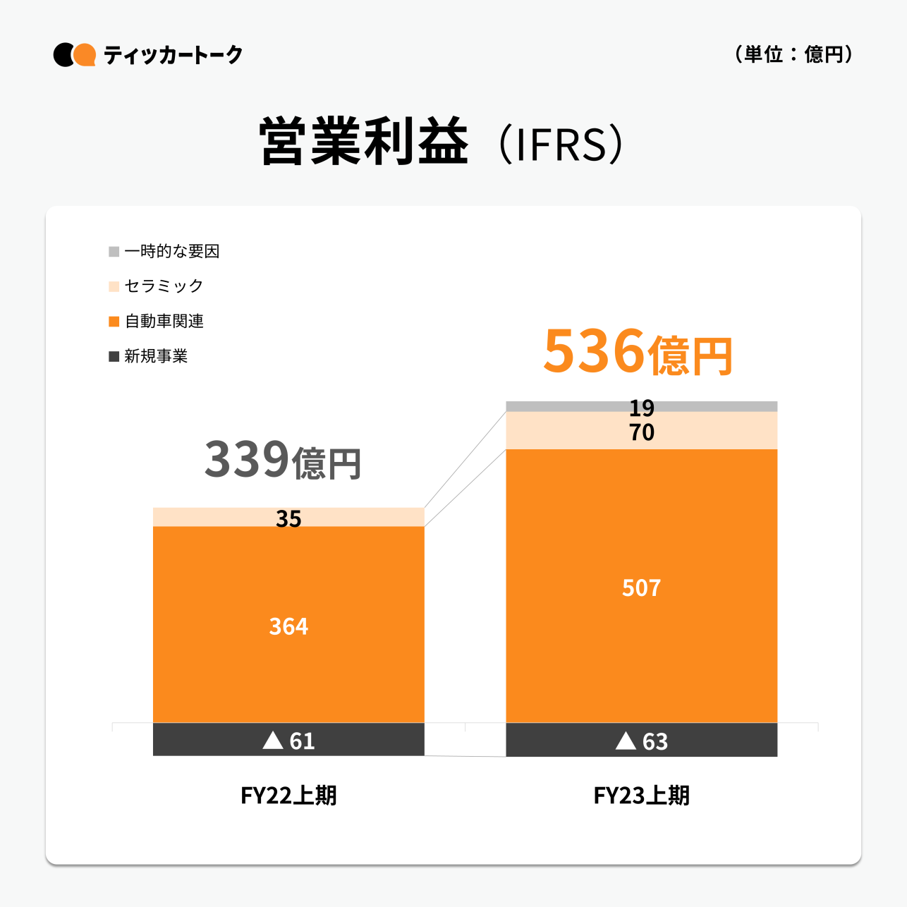 売上収益・営業利益ともに過去最高を更新した。上期はQ1に上海のロックダウンの影響を受けたものの、新⾞組付け⽤製品の売上は半導体不⾜からの回復基調にあり、半導体製造装置⽤部品の売上も好調に推移した。また、為替影響や販管費の抑制に加え、貴⾦属価格の⾼騰に対する価格転嫁も着実に実⾏したことなどが背景としてある。