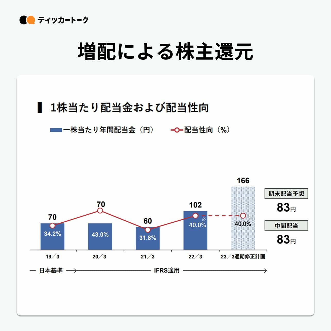 通期業績予想の修正に伴い、前年から64円増しの年間配当166円へ変更。
