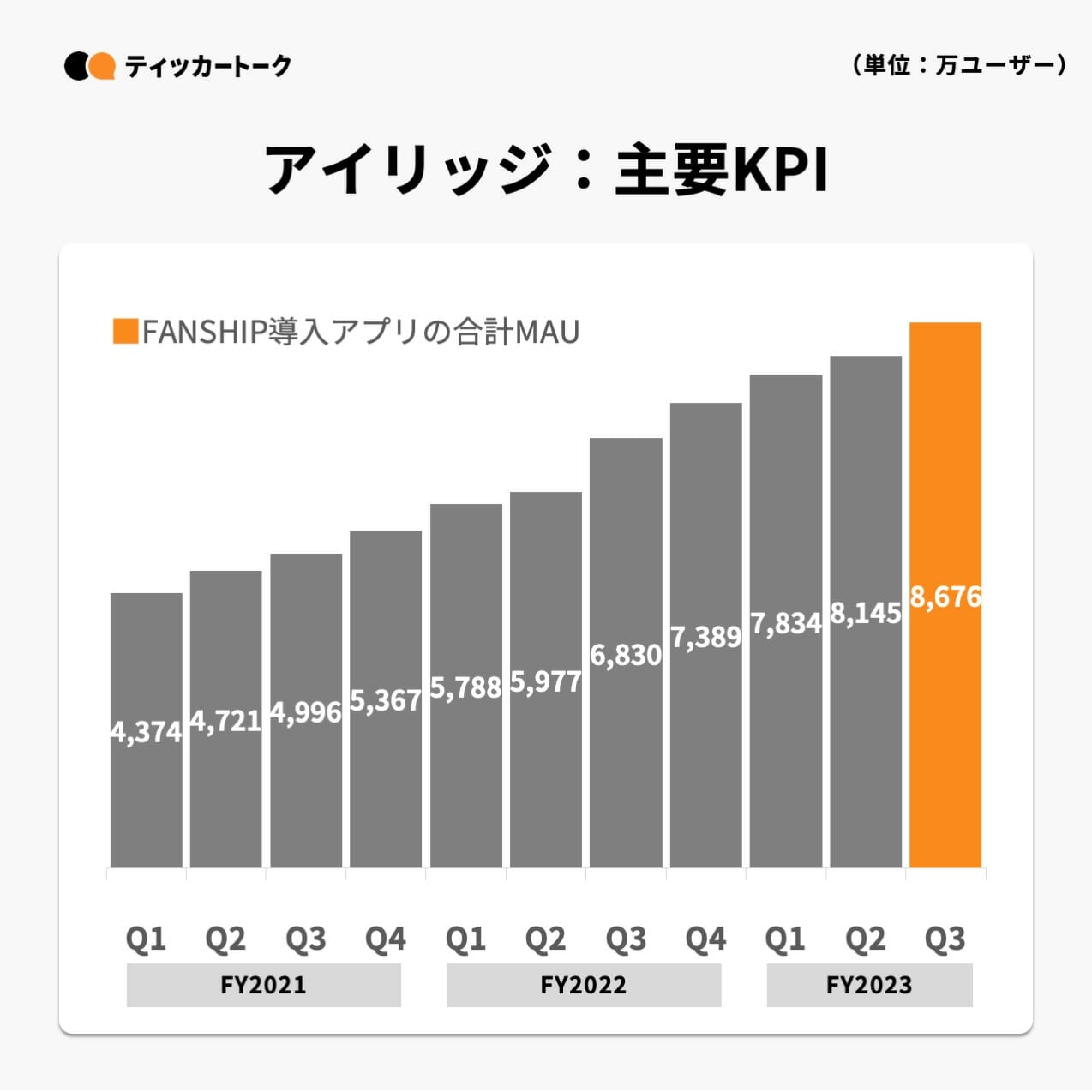 主要KPIとなるFANSHIP導入アプリの合計MAUは既存アプリの利用ユーザー数増加により、前年同期比+27%の8,676万ユーザーとなった。