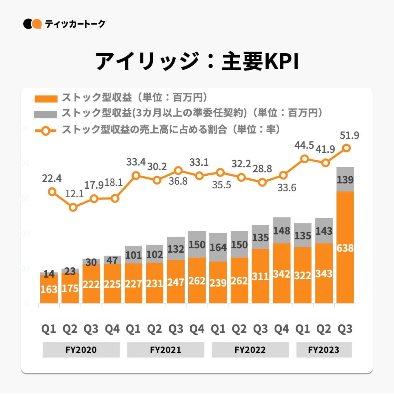 FANSHIP導入アプリのMAUが増加したこと、「MoneyEasy」の新規導入に伴うライセンス収益が重なったことにより、Q3のストック型収益は前年同期比+74.5%と大幅に増加。