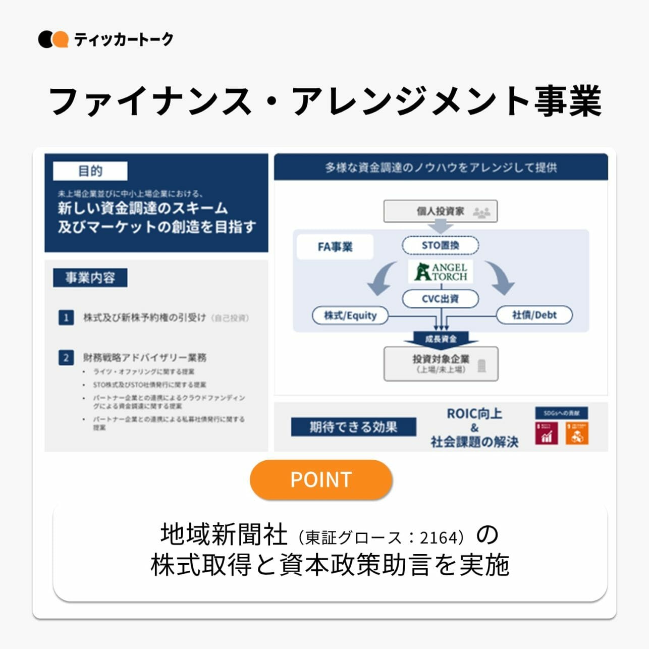 不動産領域以外の事業収益である”脱”不動産事業収益の一翼を担う事業としてスタート。第一弾として地域新聞社の株式取得と資本政策助言を実施