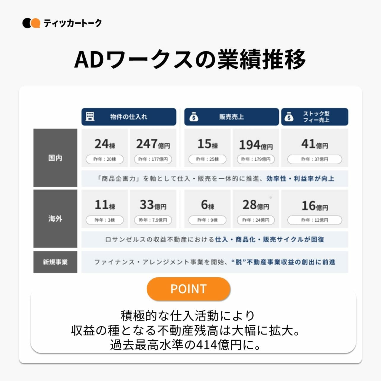国内海外ともに物件仕入れ、販売売上、ストック型フィーが増加