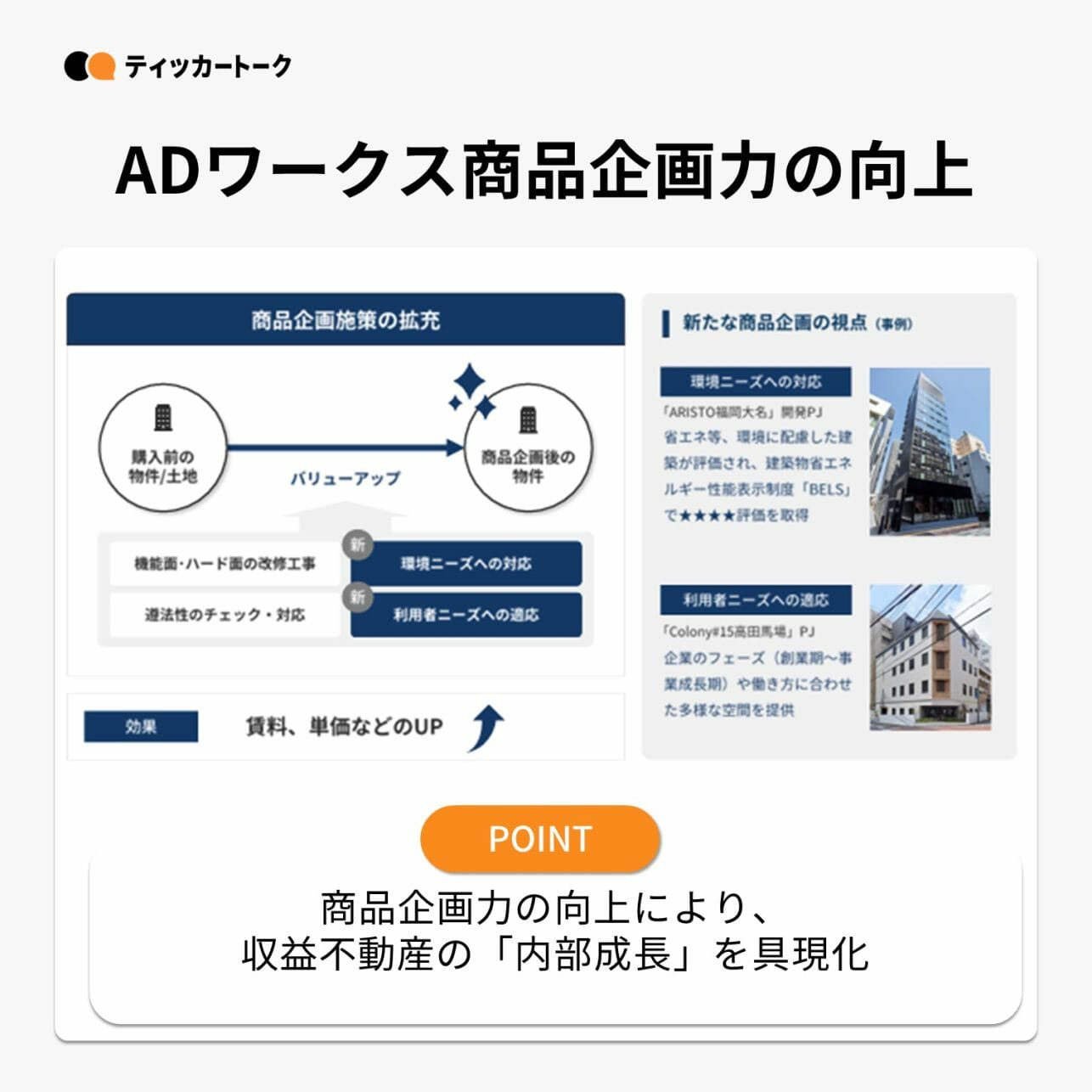 商品企画力の向上により、収益不動産の「内部成長」を具現化。賃料、単価などのUPに寄与