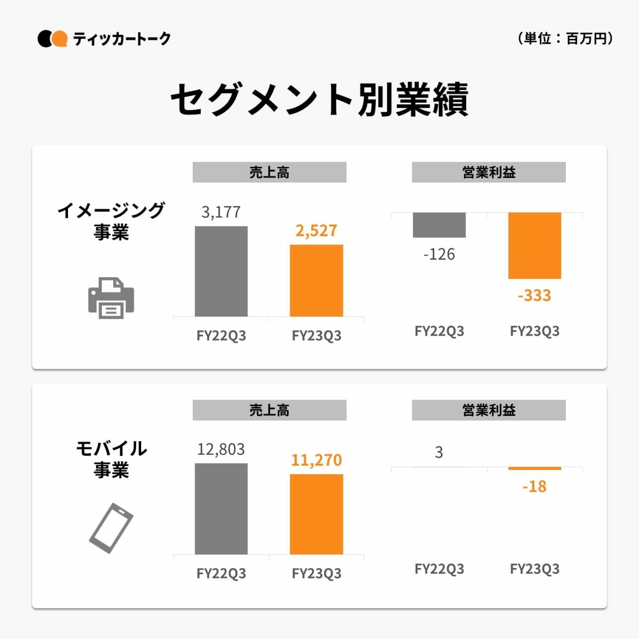 イメージング事業はフランチャイズ化により収益構造が変化し売上高減少新規事業の開発コスト増加により営業損失も増加となった モバイル事業は2021年から本格化している市場変化を受け売上高営業損益ともに減少となった