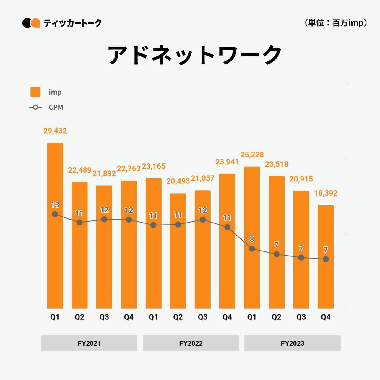 Gunosy Adsとのクロスセル強化を進めているものの、市況の変化もあり、imp、CPM共に低調推移。