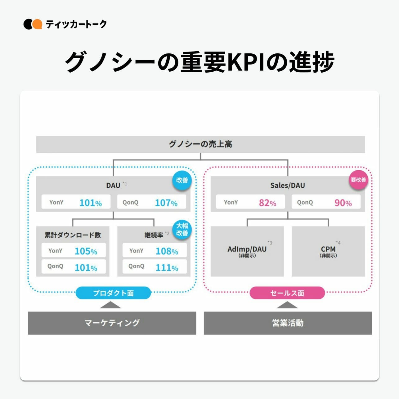 QonQは全体としてプロダクトKPI好調に支えられ安定的に推移。YonYはADNWの不調に加え、純広告需要の取り込みが弱かったことなどからGunosy Adsが伸び悩み減収。営業オペレーション強化による、プロダクトKPIの伸びに沿った売上高成長の安定実現が課題。