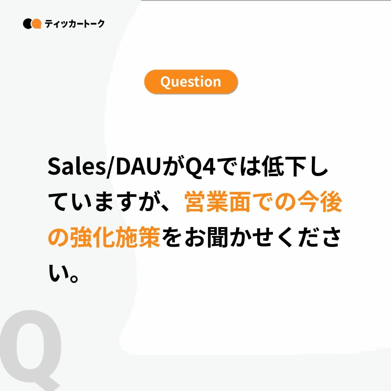 2025年5月期の連単での営業黒字化を目指しており、これを達成する規模まで拡大することが目標となります。 イメージとしては2024年5月期において、2023年5月Q4のDAUから10%程度の成長を想定しております。