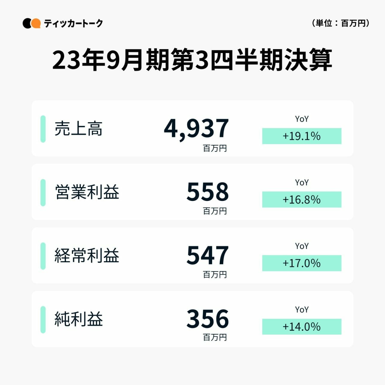 売上高は、前年同期比19.1%増の49.4億円。親会社株主に帰属する当期純利益は、同⽐0.4億円増の3.6億円となった。