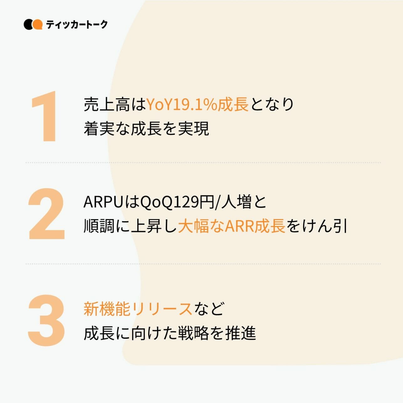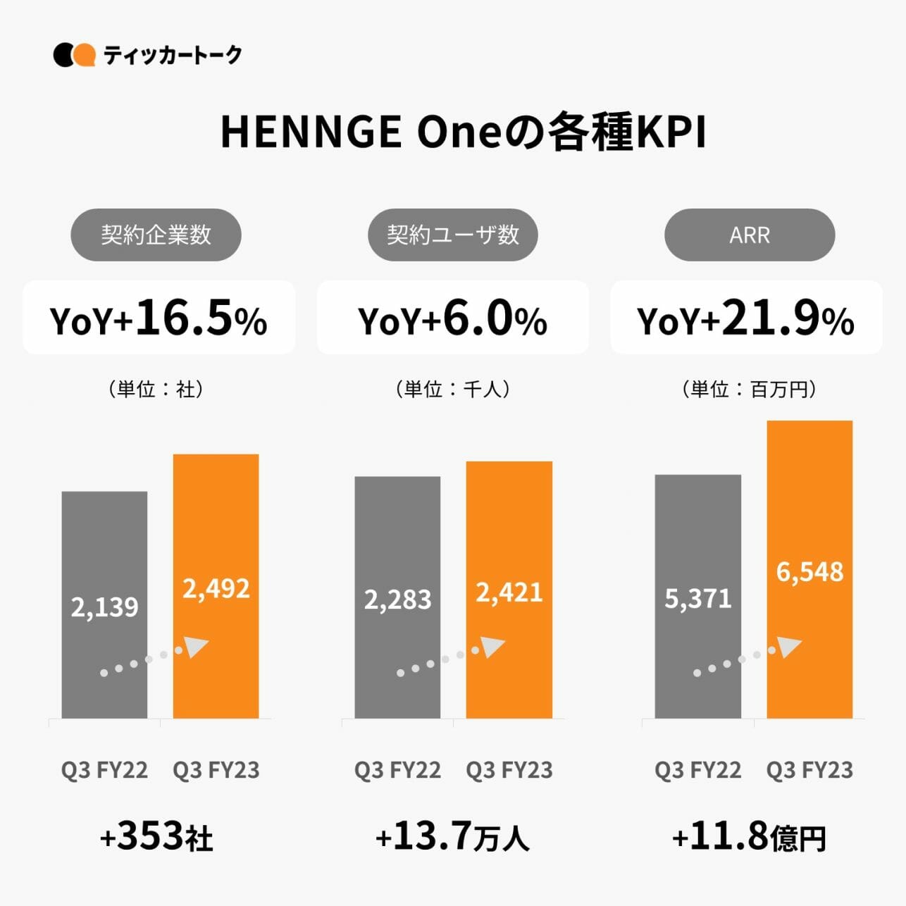 新プランでの新規販売に加えて、既存顧客の新プラン移行が前四半期末時点で5割強であったものの、当四半期末には約8割まで進んだことでARPUは順調に上昇し、ARRは大幅な増加で着地。比較的中小規模の契約を安定して獲得した結果、契約企業数は好調に増加。
