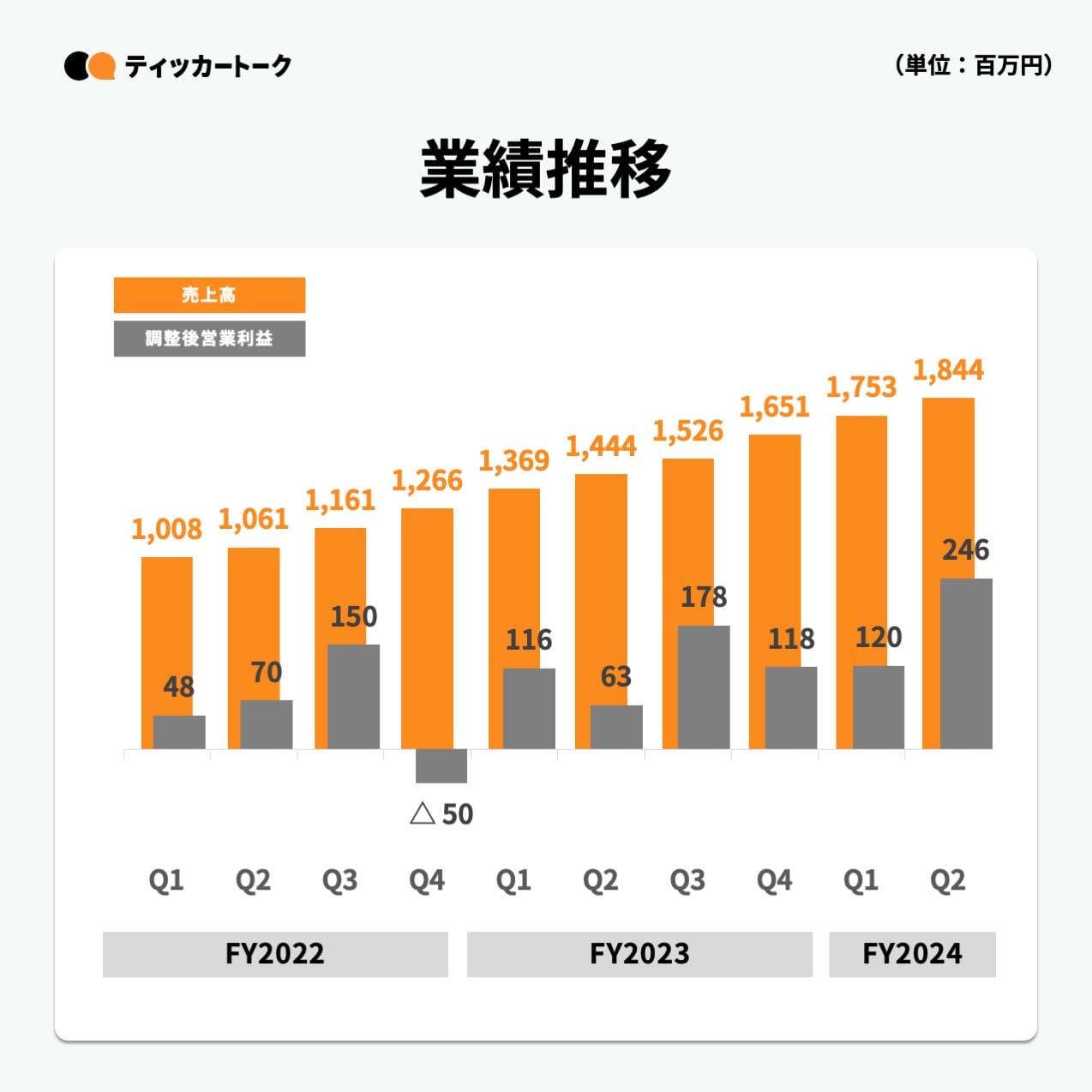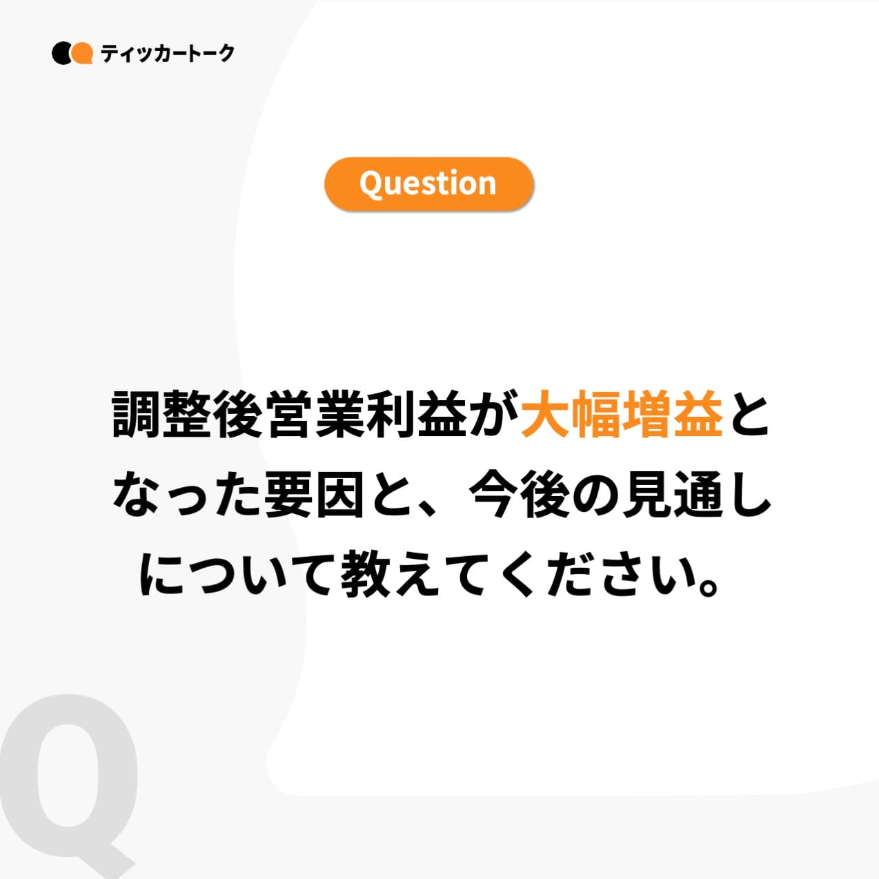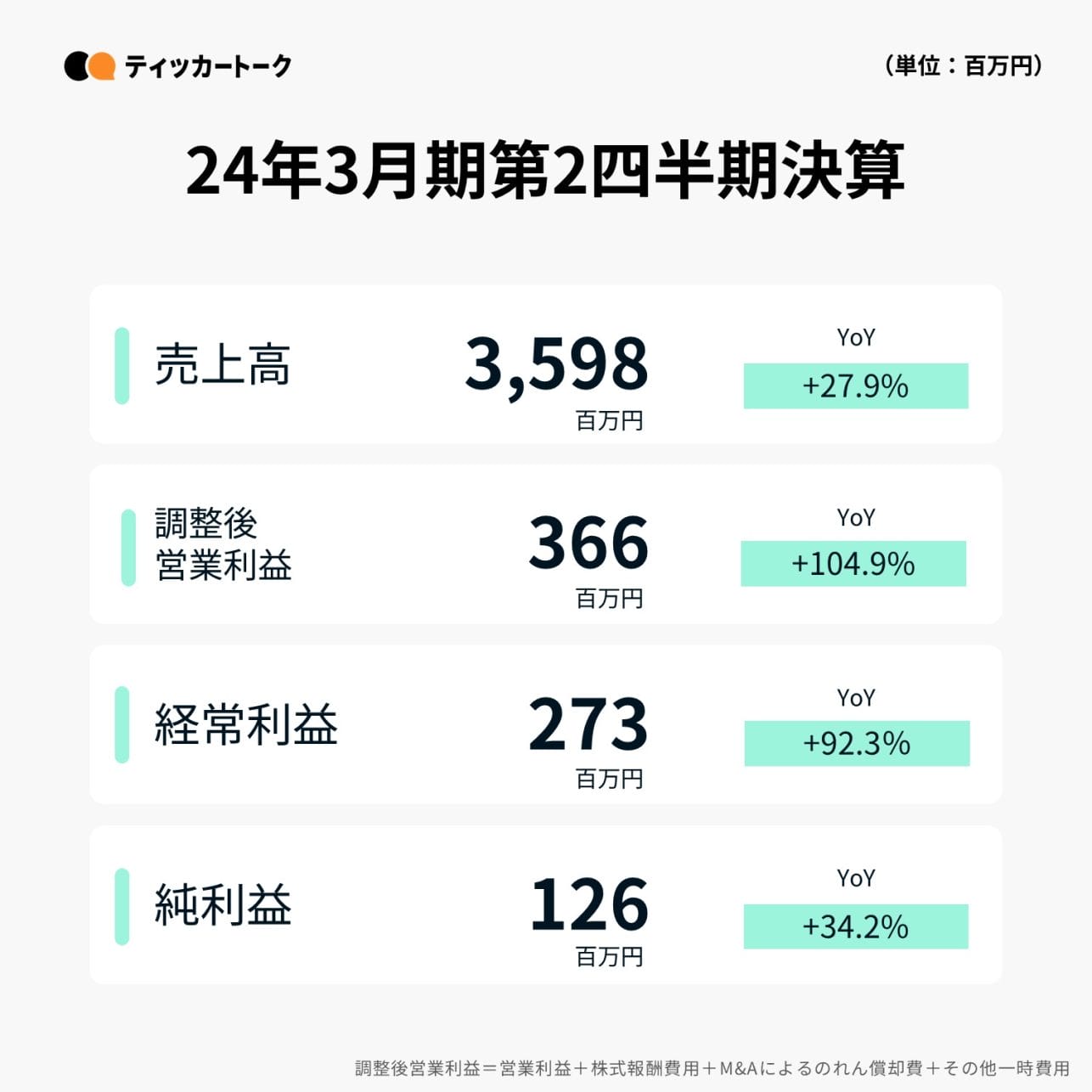売上高はYoYで27.9%増の3,598百万円、調整後営業利益はYoYで104.9%増の366百万円となった。