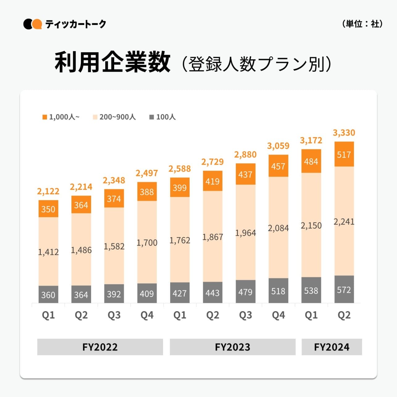 利用企業数は、機能開発を通じたプロダクト強化が奏功し、YoYで22.0%増の3,330社となった。