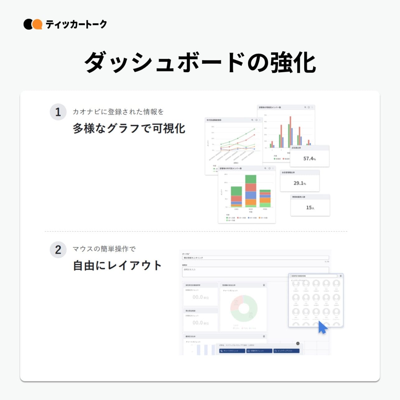 カオナビに登録された従業員データを集計し、グラフの作成や共有ができる「ダッシュボード」機能をリニューアル。目的に応じて様々なグラフやリストを自由に配置することができ、関係部署への共有や人的資本の情報開示にも活用できる。