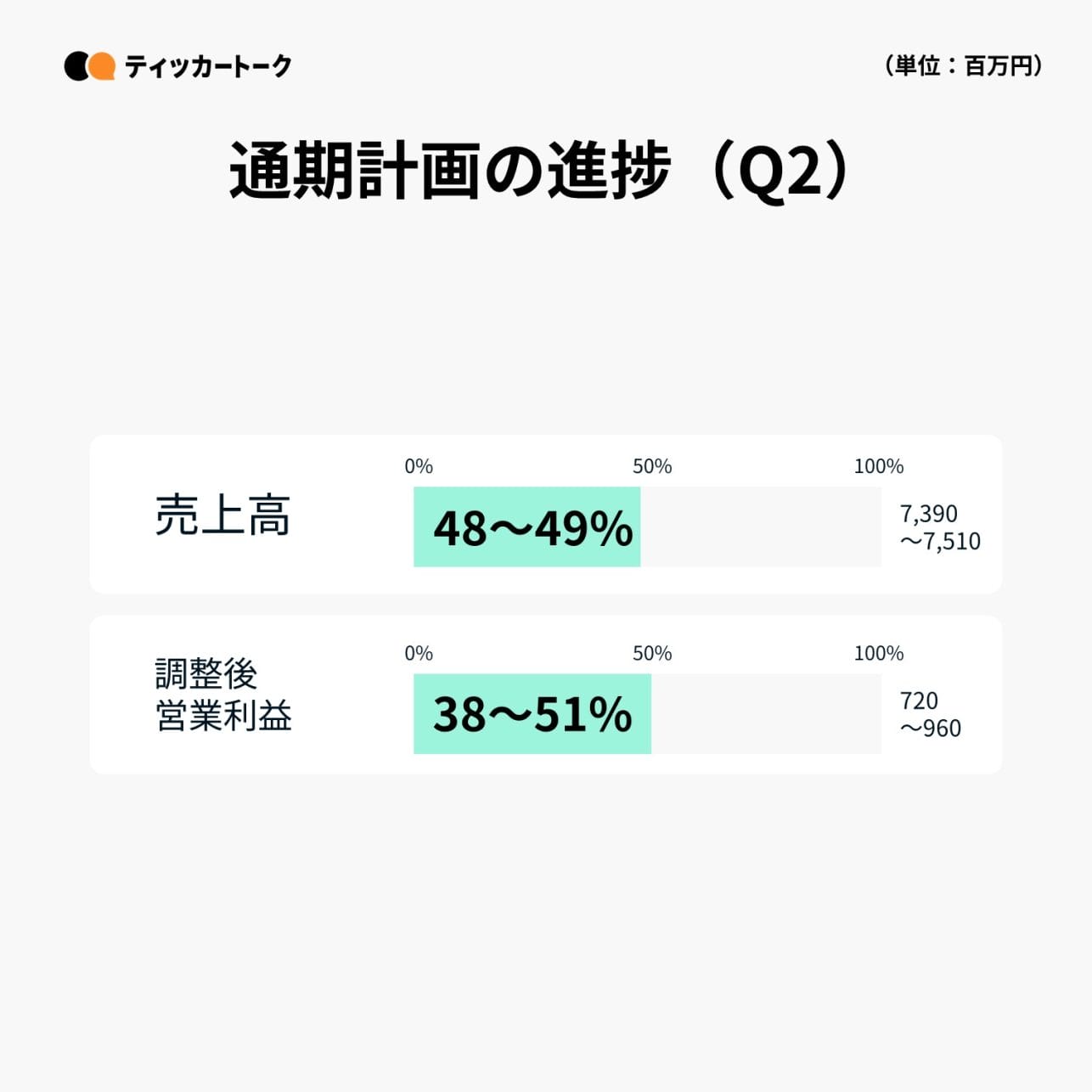 通期業績予想に対し売上高は47.9~48.7%の進捗。主要コストである人件費とマーケティング関連費用も計画に対してインラインであることから、通期業績予想に対して順調に進捗しており、業績予想の変更はなし。