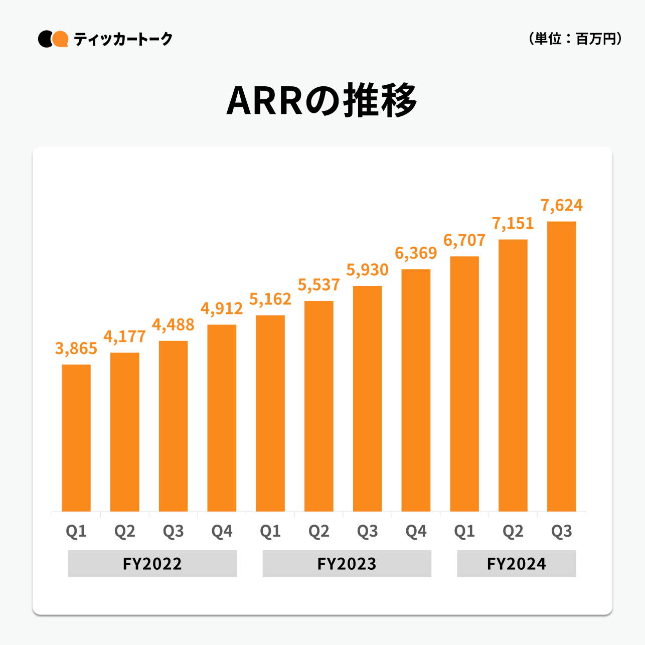 ARRは持続的かつ安定的に成長し、YoYで28.6%増の7,624百万円となった。