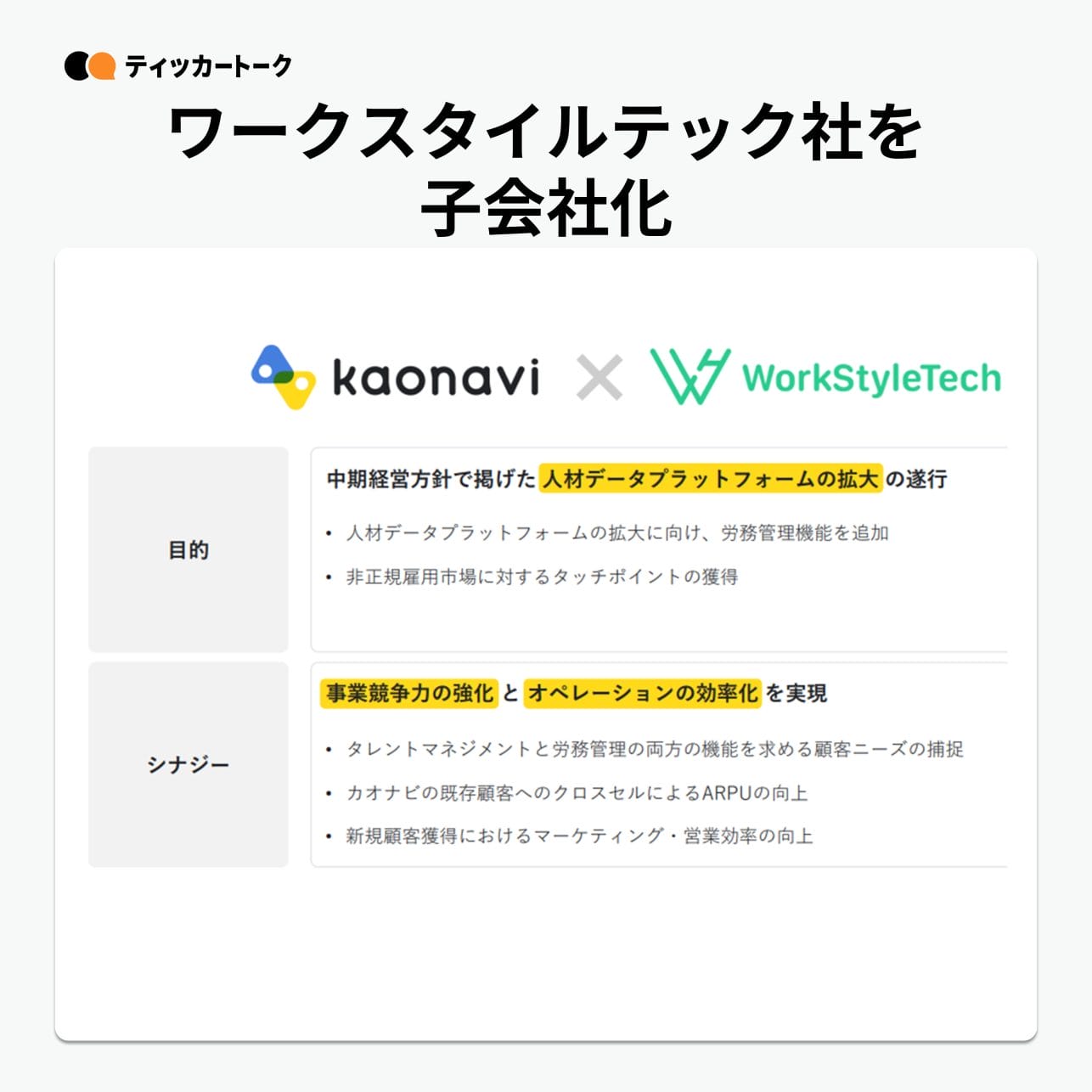また、ワークスタイルテック社は非正規雇用市場にもフィットしたサービス設計に強みがあり、当社が事業展開していない非正規雇用市場に対するタッチポイントの獲得にも繋がります。
