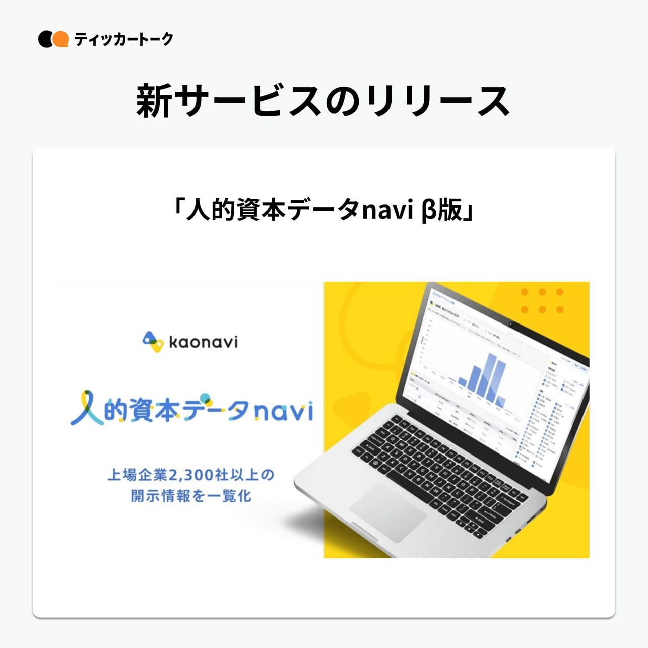 上場企業の人的資本開示情報を一覧化した「人的資本データnavi β版」をリリース。2,300社以上の開示情報を確認することができ、自社との比較や目標値の検討に活用できる。