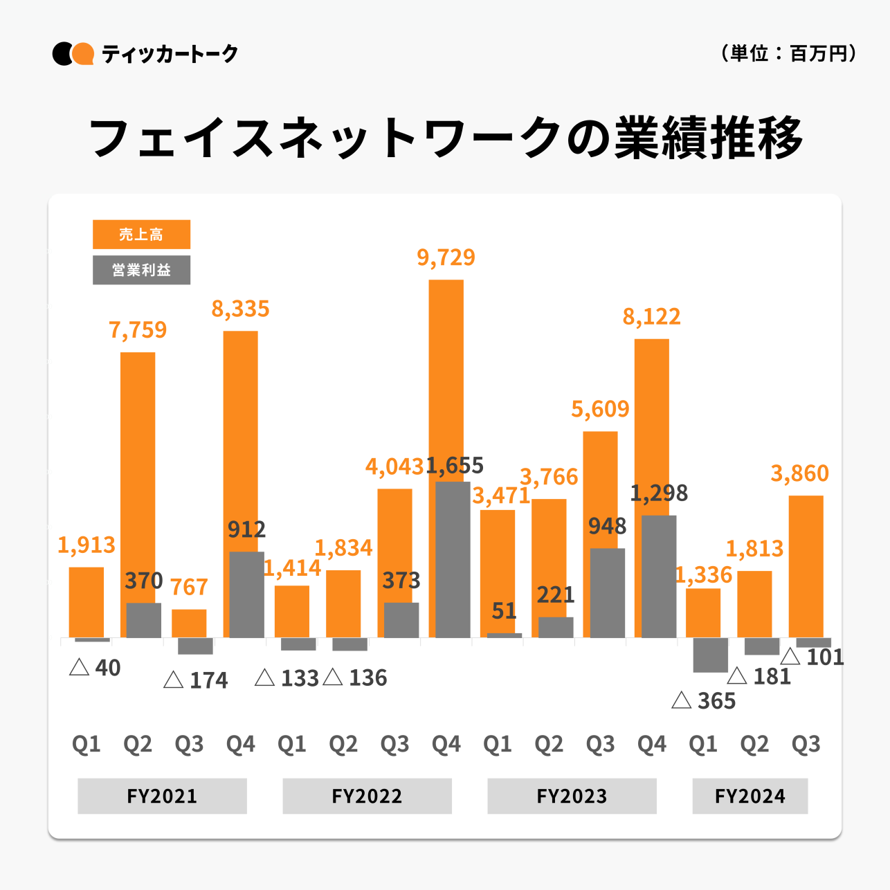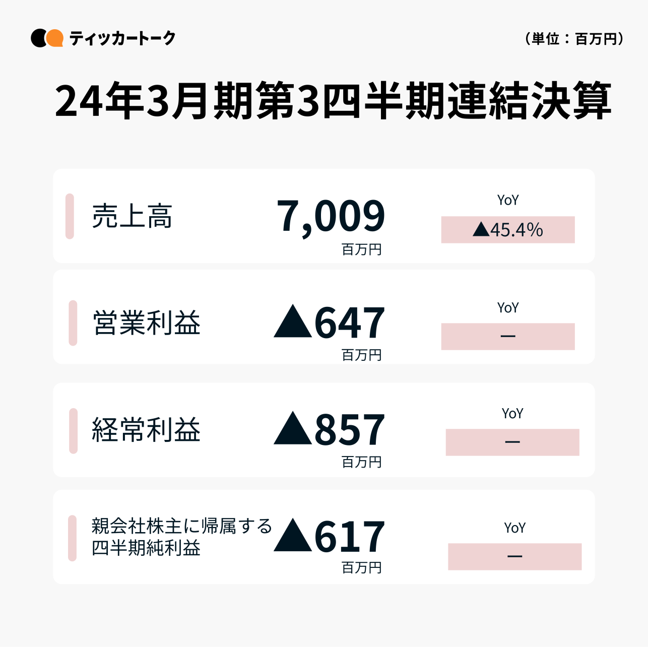 フェイスネットワークは2024年2月14日、2024年3月期第3四半期連結決算を発表した。売上高はYoYにて46.5%減(ご参考)の7,009百万円、営業利益は▲647百万円となった。