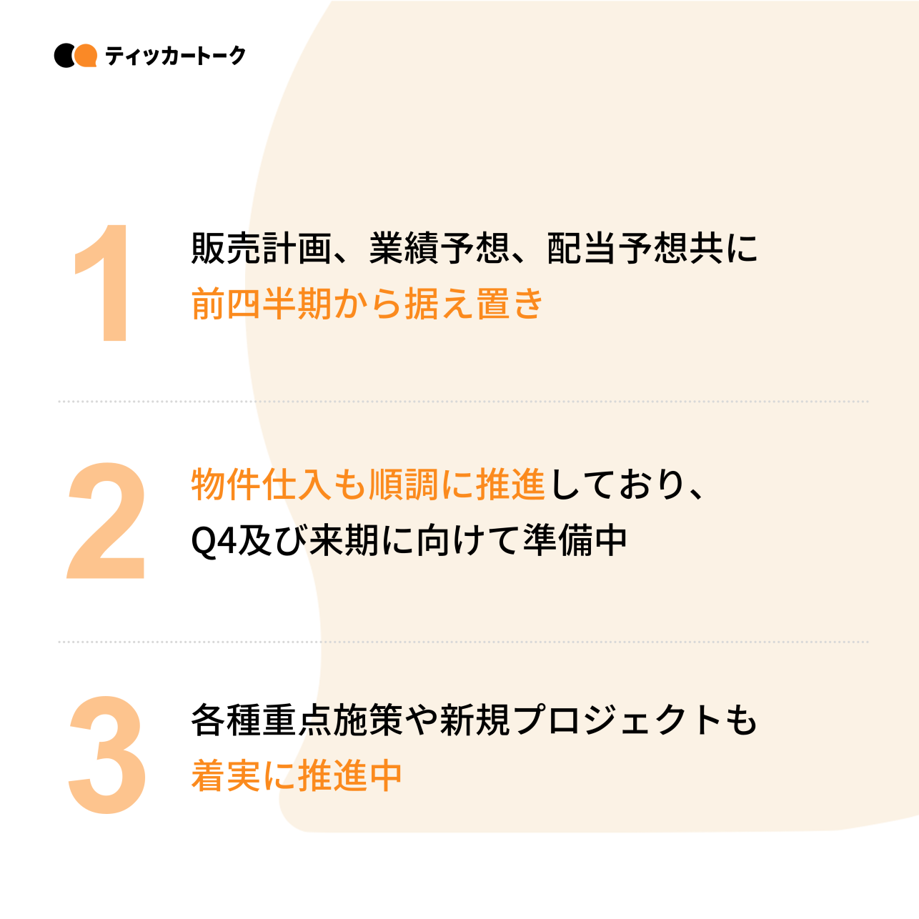 売上高はQ3単体で3,860百万円、営業利益は▲101百万円とYoYにて減収減益の結果となった。不動産業界の特性上、第4四半期に売上・利益が偏重する傾向があり、当事業年度は特にその傾向が強い。用地仕入・物件開発は順調な進捗を見せている。