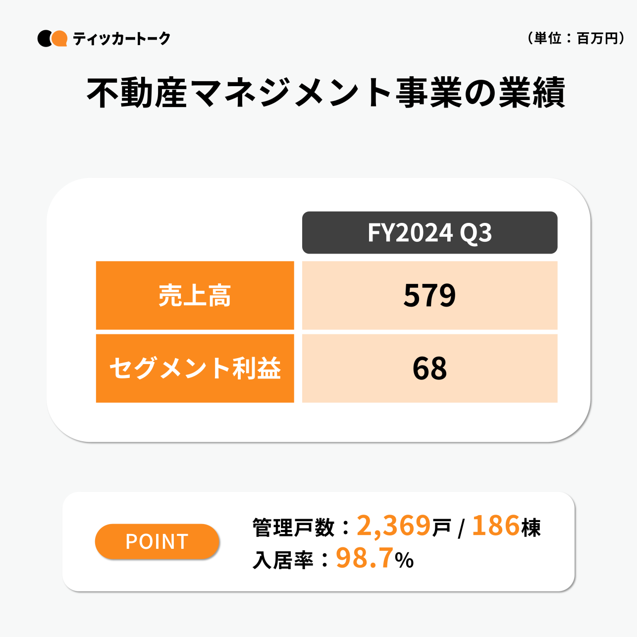 管理戸数が前年に比べて増加したことにより、売上高はYoYにて増収の結果となった。セグメント利益は販管費の微増や共通費の配賦により横ばいとなっている。入居者支店の物件開発が評価され、入居率は堅調な推移を見せている。