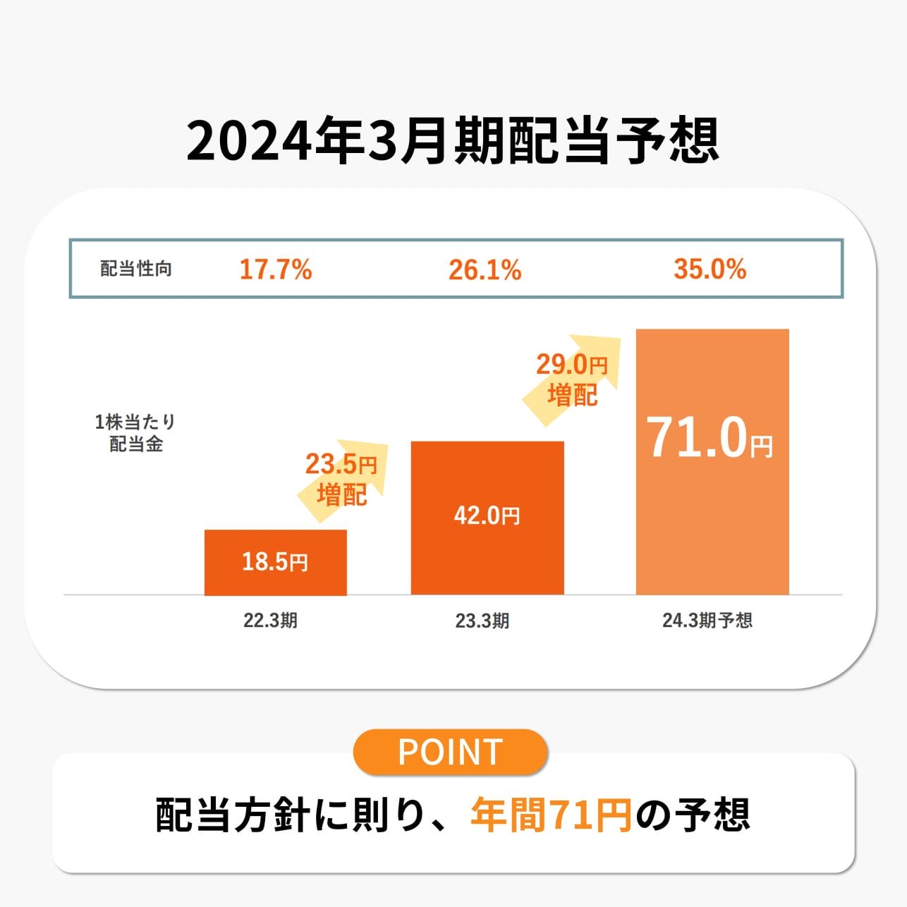 業績予想、配当予想は前回と変わらず据え置きとなっており、年間71円の予想となっている。