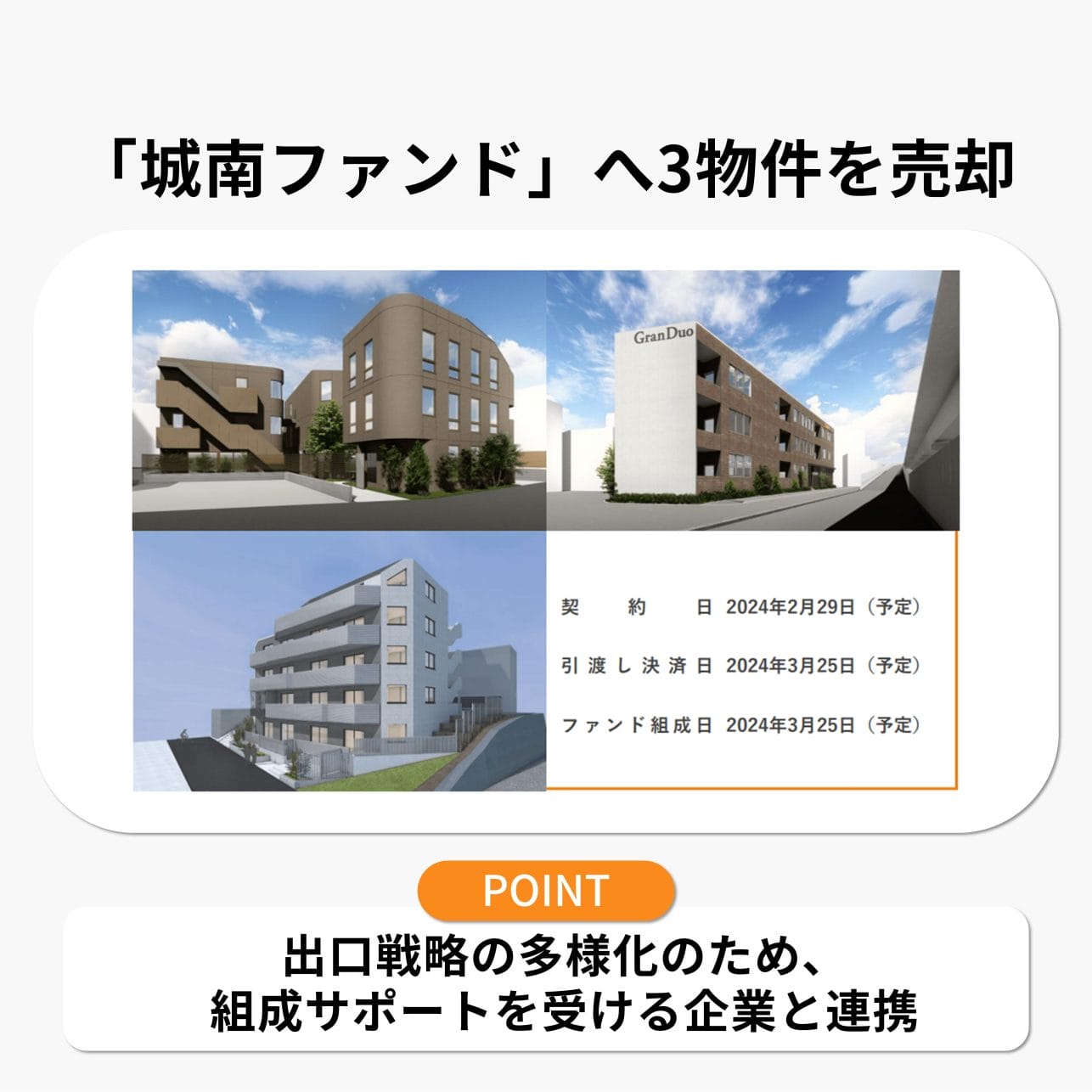 みずほ信託銀行株式会社及びみずほ不動産投資顧問株式会社が組成サポートする合同会社「城南ファンド」に開発した3物件の売却を予定している。今後、出口戦略の多様化を進めるべく、組成サポートを受ける企業と連携し、ファンド規模を拡大する私募ファンドへの物件売却を推進。