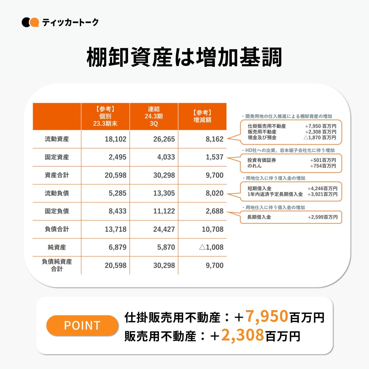 開発用地の仕入推進・物件開発の進捗により棚卸資産は前期末、Q2との比較で増加しており、堅調な進捗を見せている。