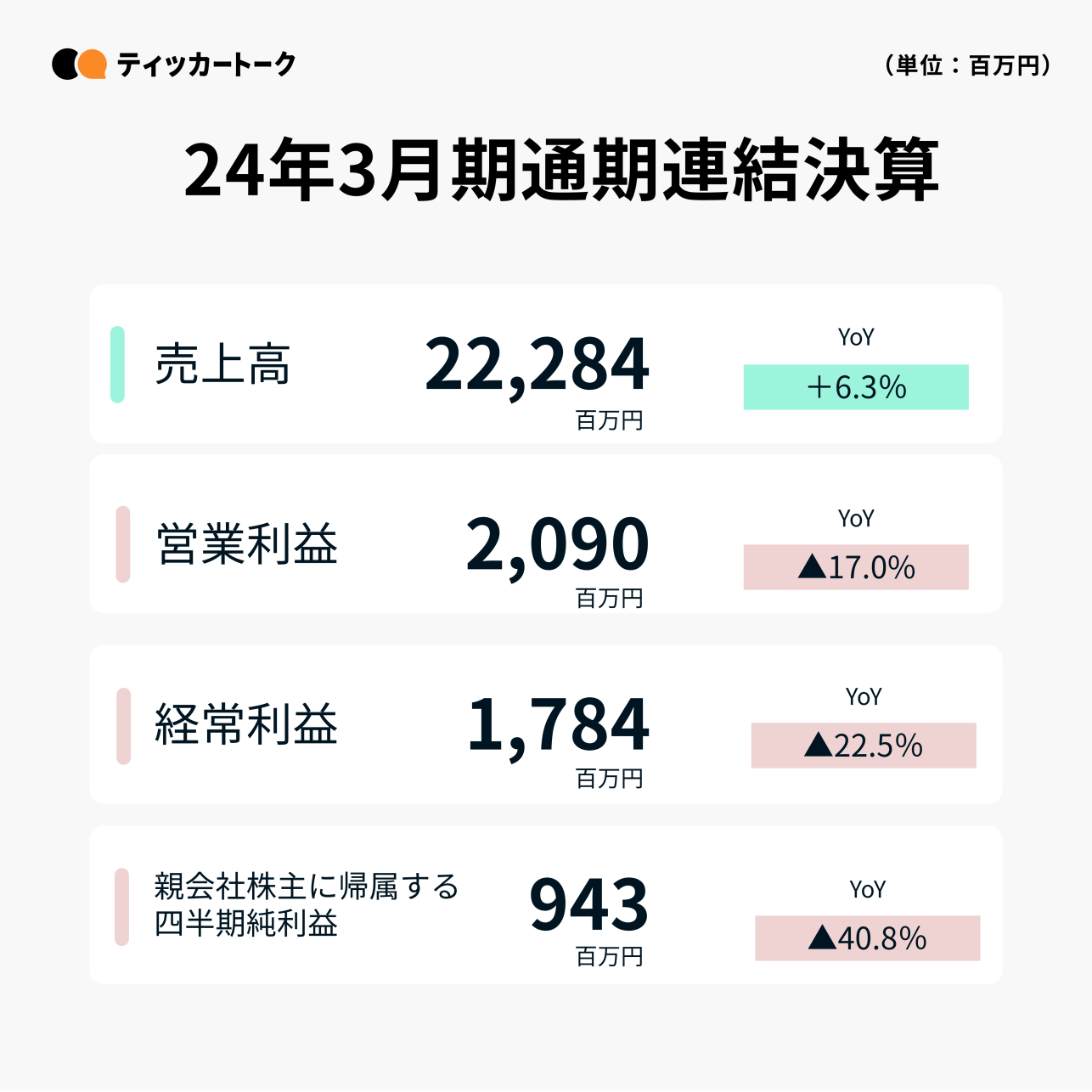 売上高はYoYで6.3%増の22,284百万円となったものの、経常利益は22.5%減の1,784百万円となった。