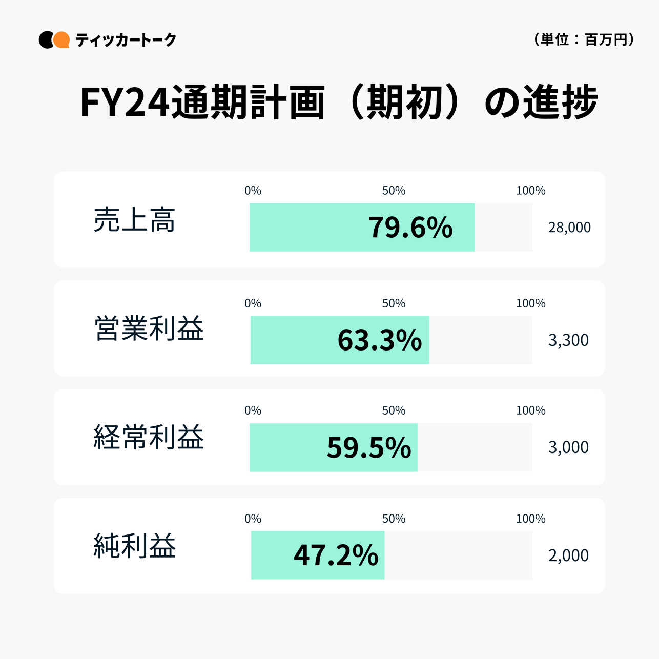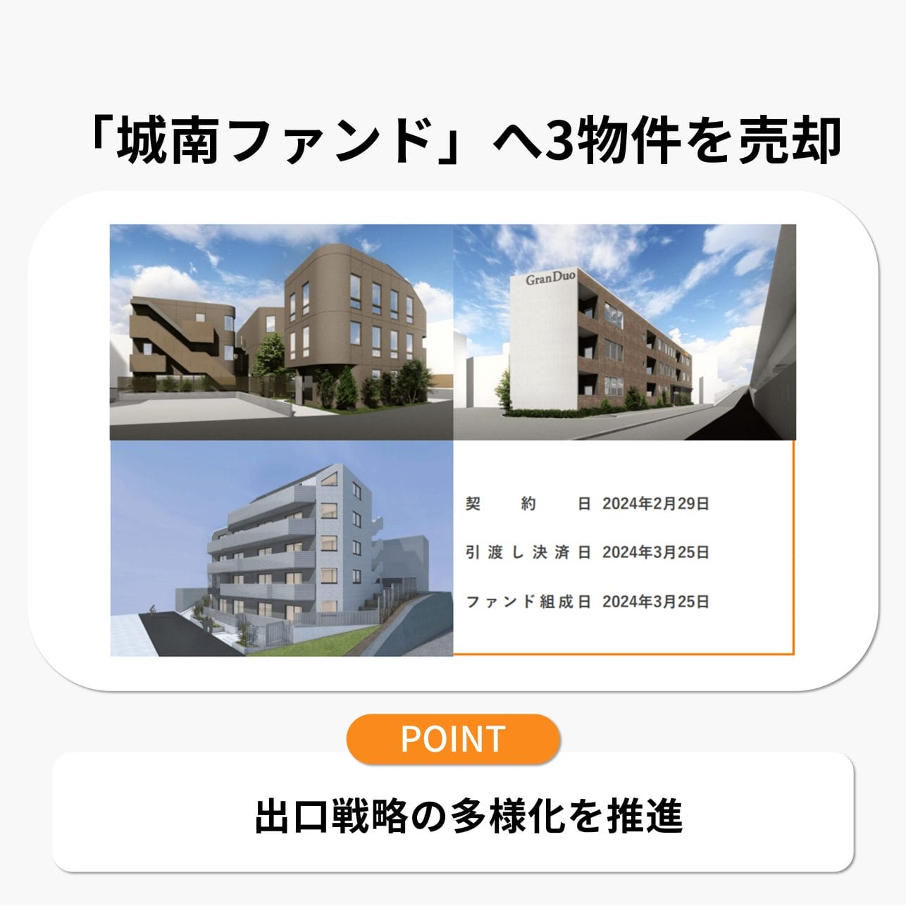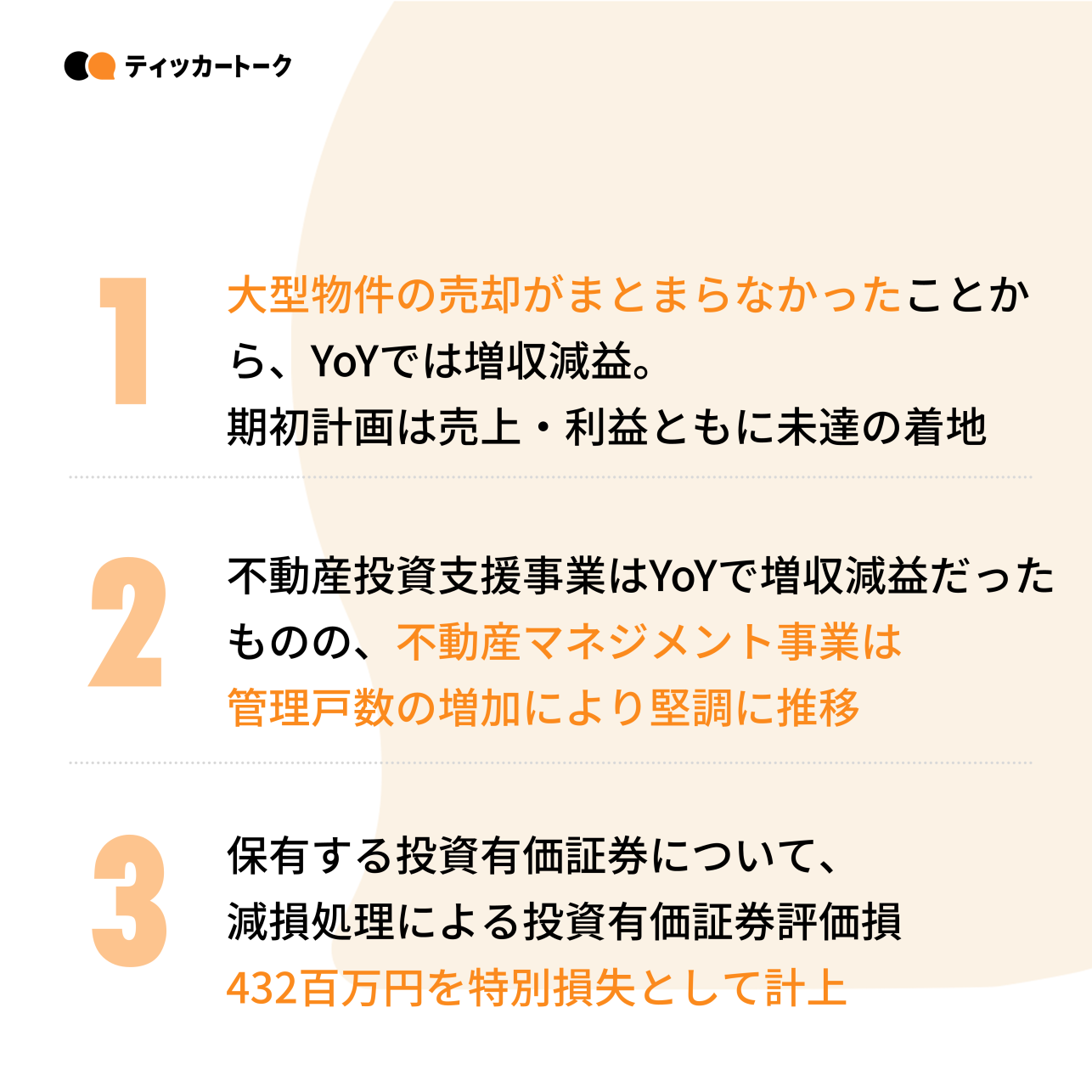 2023年5月15日に発表した期初計画に対し、大型物件の売却交渉がまとまらなかったことから2024年3月22日に下方修正を行った。修正計画に対する進捗は概ね計画通りだが、特別損失の計上により当期純利益は修正計画を下回る形となった。