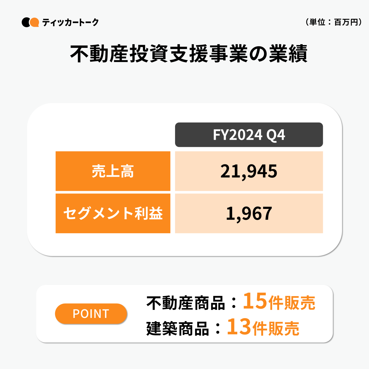 不動産投資支援事業は、過去最大規模の大型物件の条件交渉に時間を有し、期中の販売が難しくなったことから、売上・利益ともに計画を下回る結果となった。