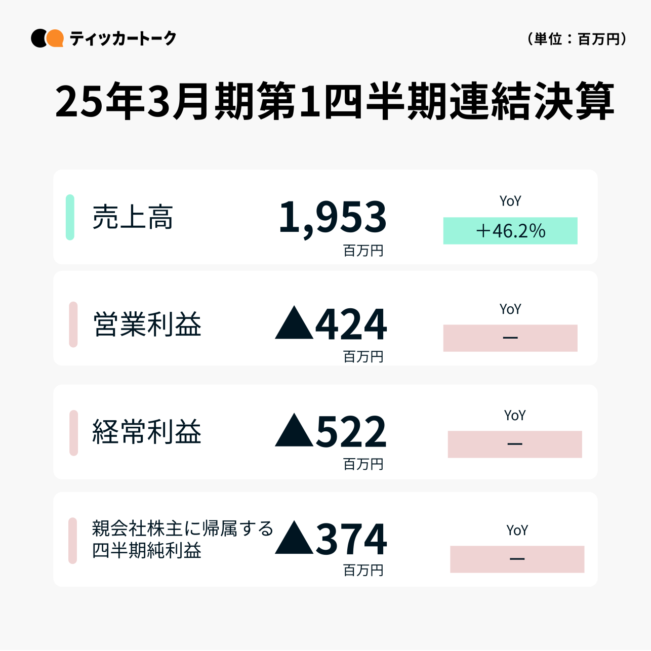 売上高はYoYにて46.2%増の1,953百万円、営業利益は▲424百万円となった。なお、2024年3月期3Q決算より連結決算に移行しており、前年同期からの増減率は参考値となっている。
