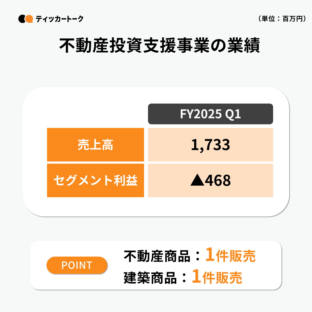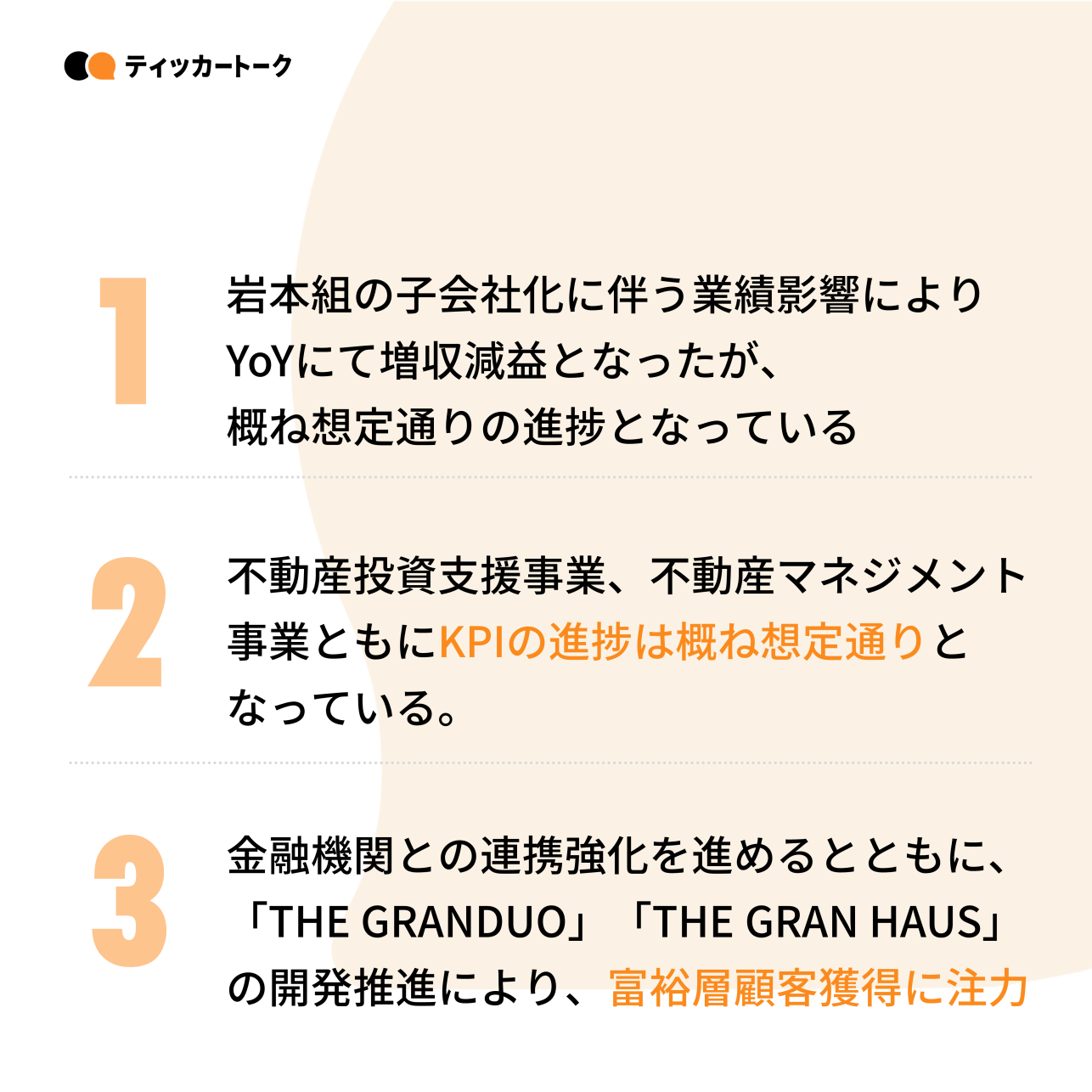 前年同期と比べ、不動産商品の規模が大きかったこと及び子会社である岩本組の売上が貢献し、売上高は前年同期を上回った。利益は岩本組の子会社化による販管費の増加により前年同期を下回った。
