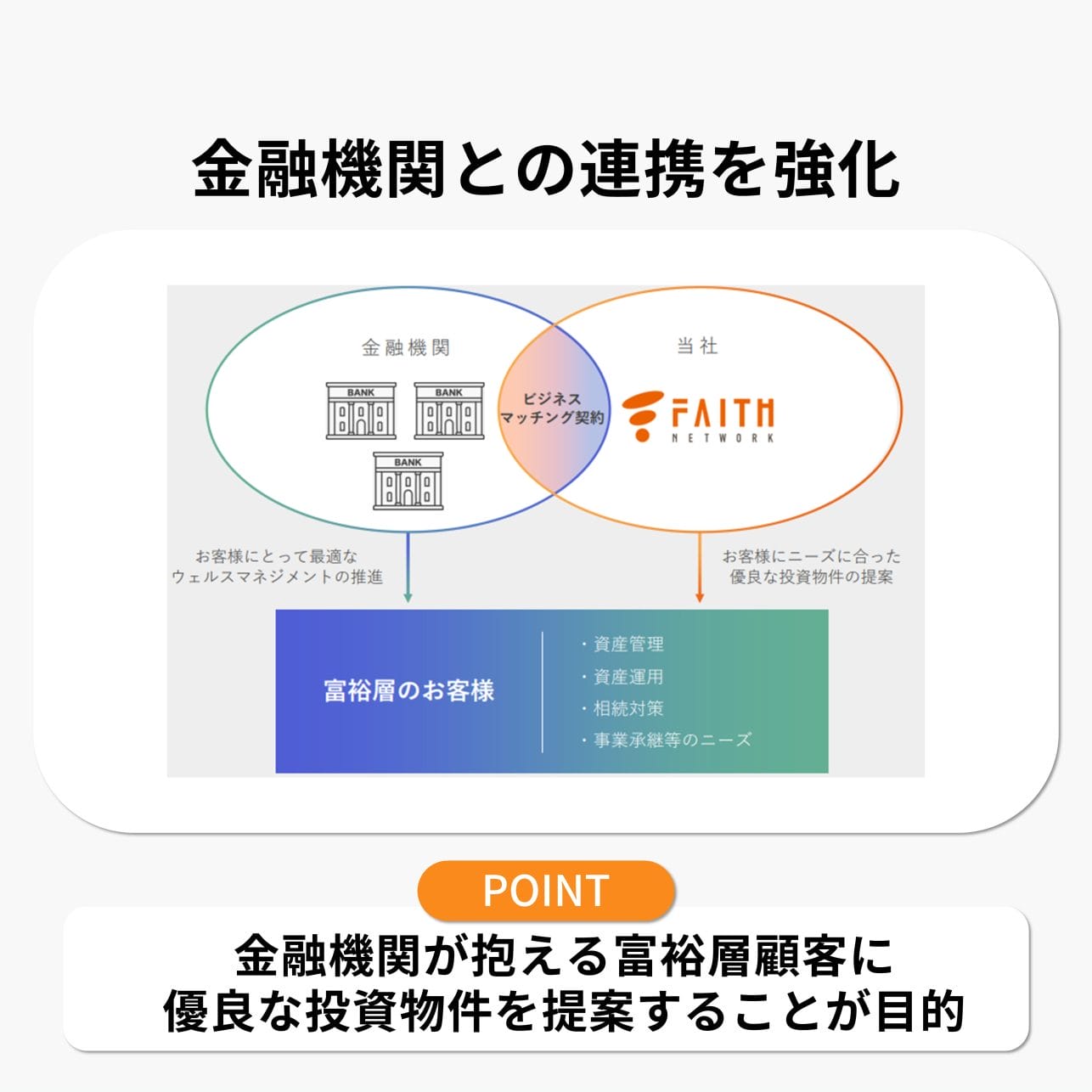 金融機関が抱える富裕層の顧客に優良な投資物件をご提案することを目的とした、金融機関との連携強化に取り組んでいる。ビジネスマッチング契約締結に向け、複数の金融機関と協議を推進している。