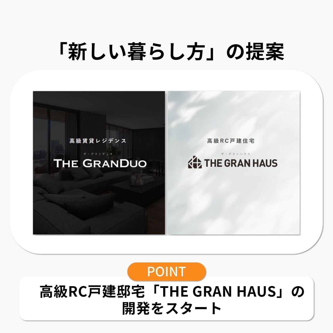 「GranDuo」に続く「新しい暮らし方」を提案する商品として高級RC戸建邸宅「THE GRAN HAUS」の開発を東京 世田谷でスタートした。2025年3月竣工を予定している。物件開発のデザインコンセプトに”Well-being(ウェルビーイング)”を掲げ、住むことでウェルビーイングな暮らしができる住まいとして、物件価値の向上を図る。