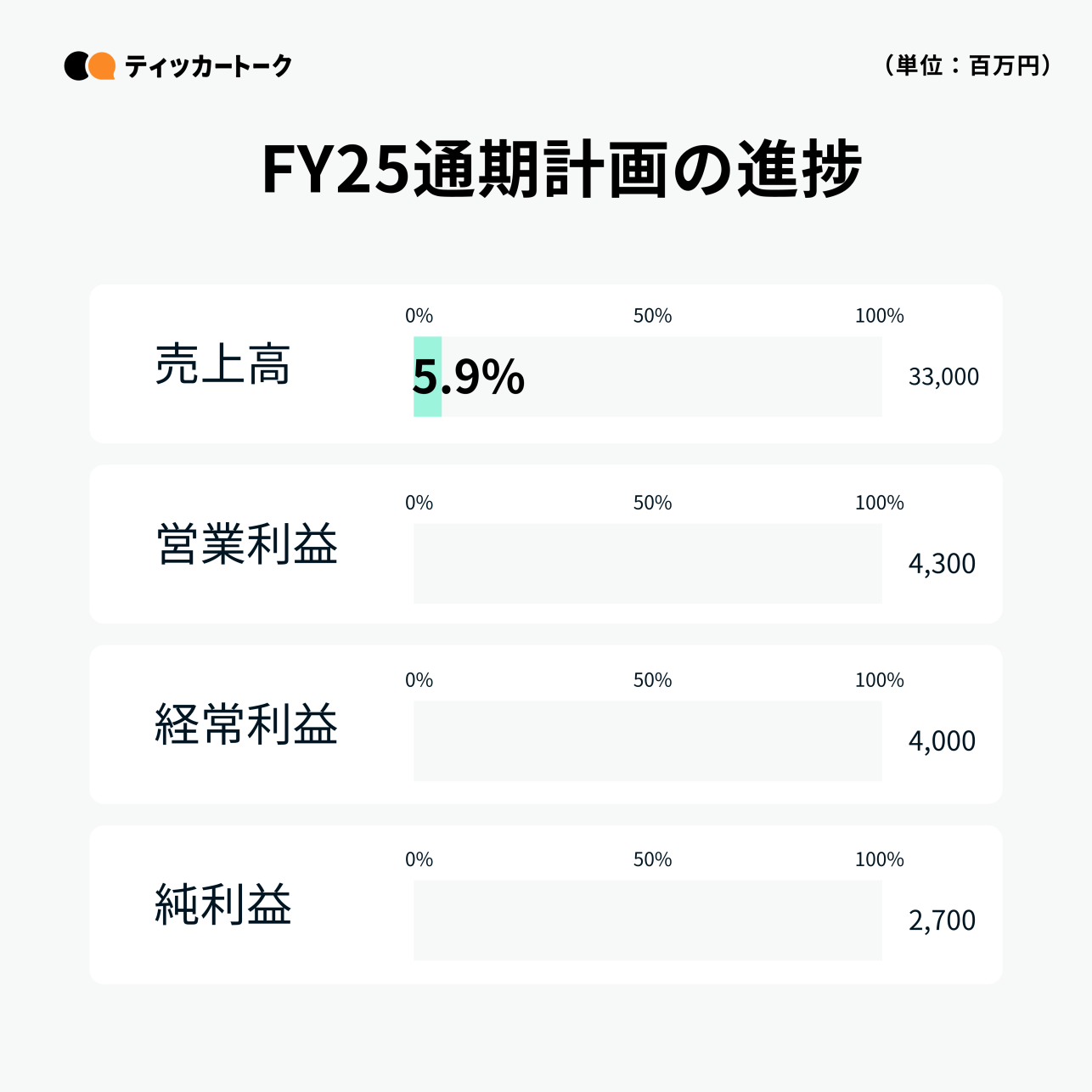 売上高の進捗率は5.9%となっている。業界特性上、下半期に売上・利益が偏重する傾向にあり、当期もその傾向で推移することが見込まれる。なお、用地仕入・物件開発に関しては概ね計画通りに進捗している。