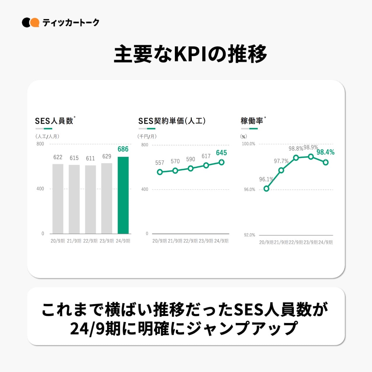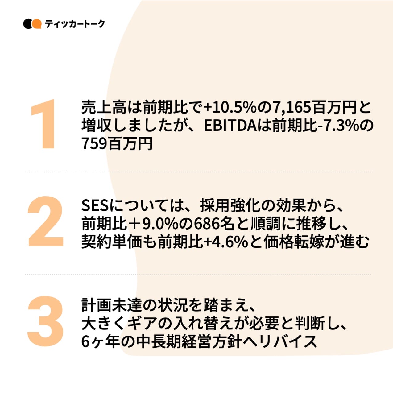 SES人員数の拡大からSES売上高が前年同期比18.6%増の1,328百万円となった点が全社業績を牽引しました増収率は1Q(231012月期)の同9.6%増から2Qの同11.3%3Qの同14.0%4Qの同18.6%増と逓増傾向にあります