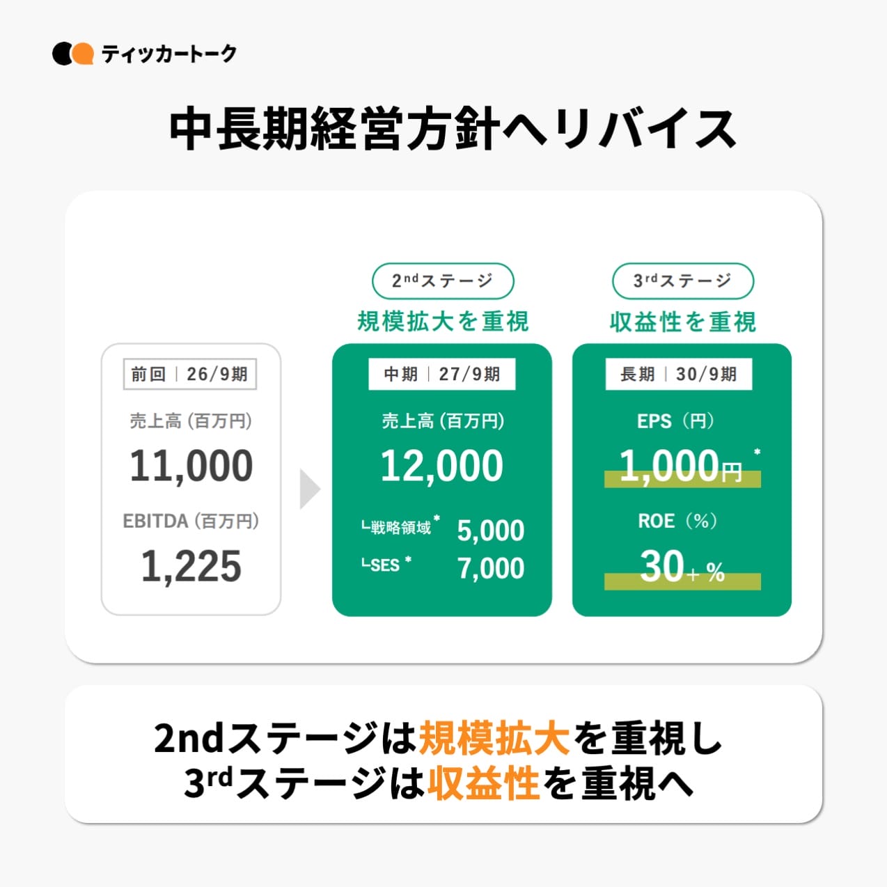 20249月期は戦略領域の未達幅が大きかったためギアの入れ替えが必要と判断しました20309月期を最終年度とする6ヶ年の中長期経営方針にリバイスしました20279月期までの2ndステージではM&Aを含む積極投資により規模の拡大と事業構造の転換を図ります戦略領域の成長を重視し売上高目標12,000百万円のうち5,000百万円を目標とします3rdステージは投資回収とシナジー創出に重きを置いてEPS1,000円とROE30%長にこだわっていきます