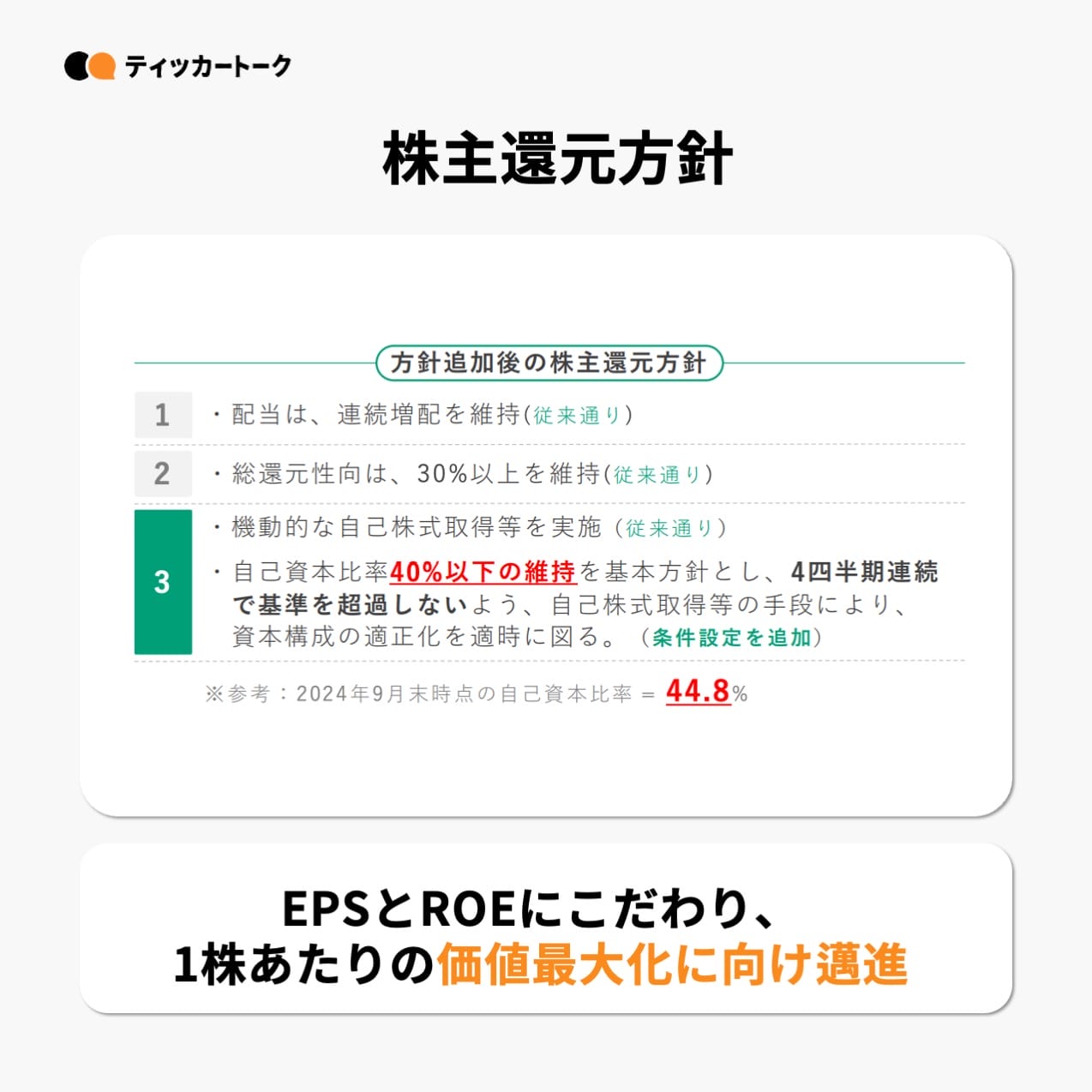 大前提として持続的成長に向けた再投資を優先する方針ですが①資金効率の良化と②株主の期待に応え るため仮に充分な投資機会M&A等に恵まれず4 四半期連続で自己資本比率が 40%を超過することが見 込まれる場合には40%を超過する自己資本を原資に追加的な株主還元自己株式取得等を含むを実施するこ とで随時資本構成の適正化を図ることと致しましたなお直近 2 四半期は自己資本比率 40.0%を超過24 6 月末は 41.3% 9 月末は 44.8%しており25 3 月末までの 2 四半期以内に資本構成の適正化が必要な 状況にあります