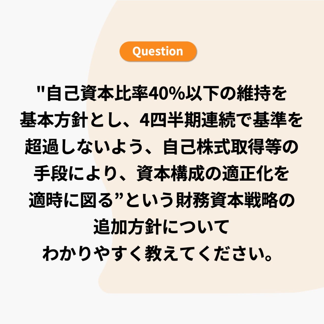 財務資本戦略を一部見直し従来掲げていた株主還元方針に加え自己資本比率≦40.0%とする新基 本方針を追加を発表これは①資金効率の良化と②株主の期待に応え続けることを目的にM&A 含む再投資に従来以上にコミットすると共に仮に充分な再投資機会に恵まれず4 四半期連続で自己資本 比率が 40.0%を超過することが見込まれる場合には40.0%を超過する自己資本を原資に資金を追加的な株主還 自己株式取得等を含むに振り向けることを意味します