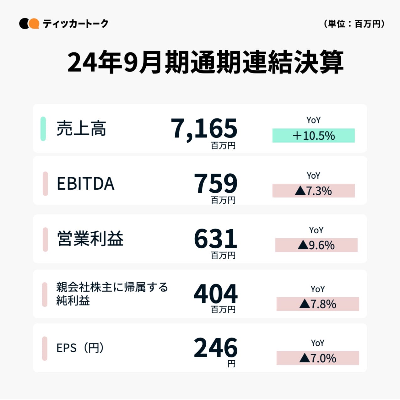 24/9期通期の売上高においては7,165百万円前期比+10.5%計画比-8.0%EBITDA759百万円前期比-7.3%計画比-9.5%EPS246.23前期比-7.0%計画比-8.0%となりました