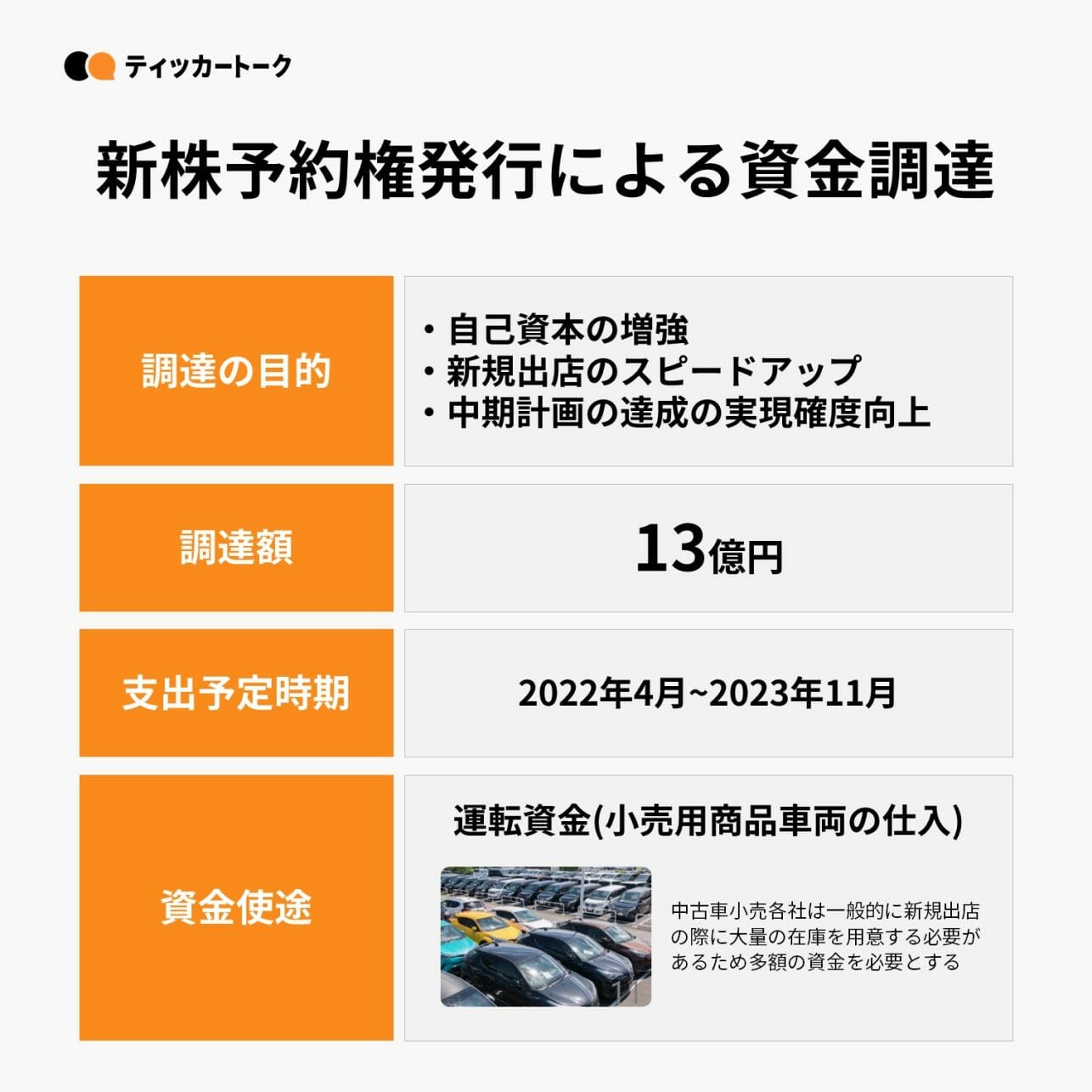 決算発表と同時に、新株予約権による資金調達を発表。13 億円を調達し、運転資金(小売用商品車両の仕入)に充当していく。全て行使されるまでは株価の重石になる可能性がある。