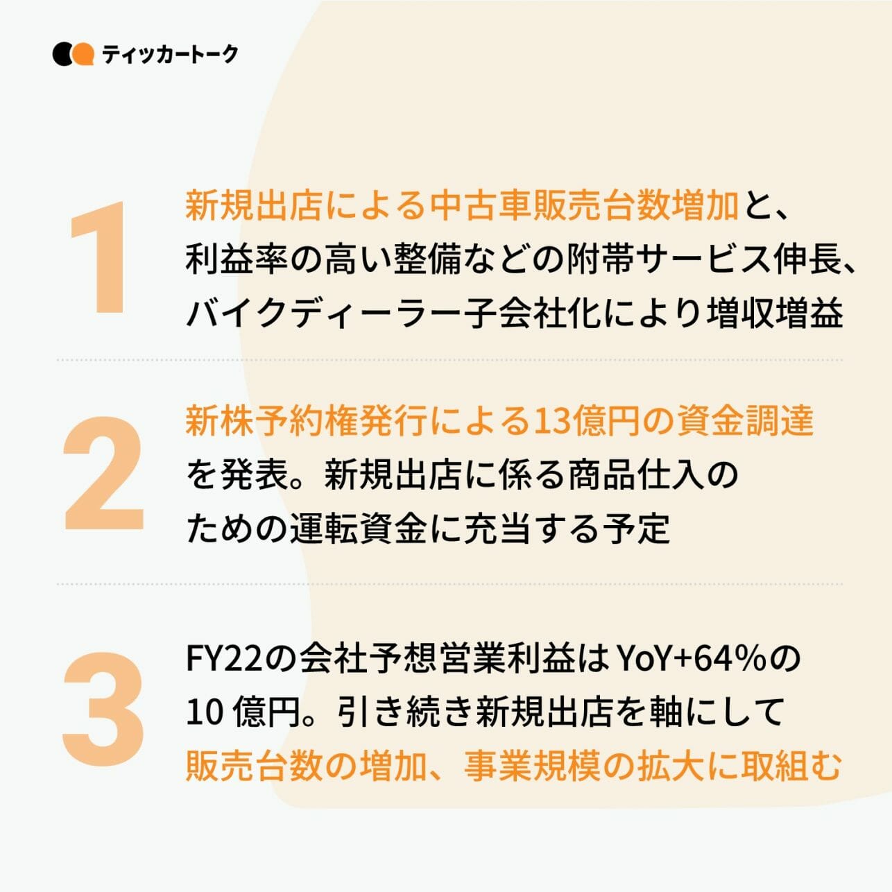 新規出店による中古車販売台数増加と、利益率の高い整備などの附帯サービス伸長、ハーレー正規ディーラーの子会社化により増収増益となった。