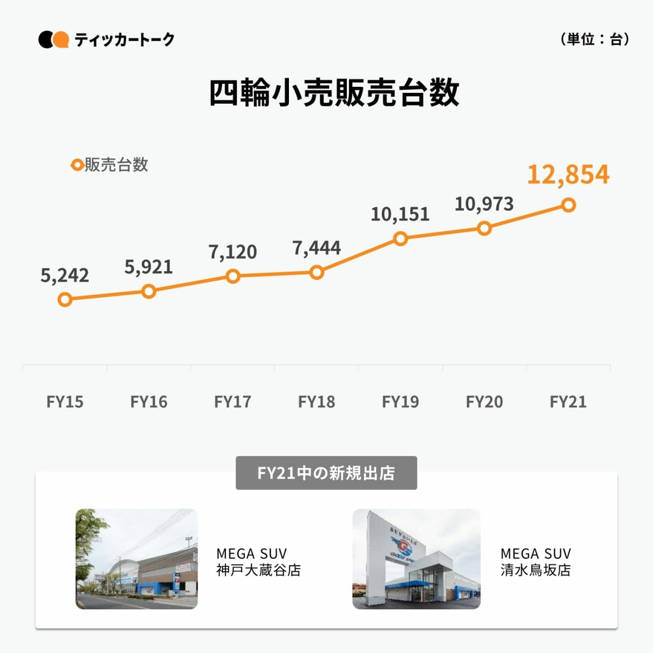 FY20に出店したMEGA SUV 東海名和店、ならびにFY21に出店したMEGA SUV 神戸大蔵谷店、MEGA SUV 清水鳥坂店が寄与し、四輪小売販売台数はYoY17.1%増の12,854台で着地。販売高としても22.9%増の増収となった。