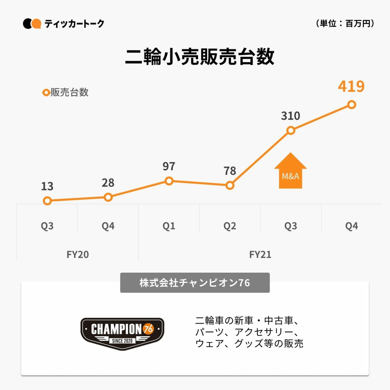 2021年3月にハーレー正規ディーラーの株式会社チャンピオン76(2021年10月に株式会社チャンピオンから商号変更)を子会社化したことで、二輪小売販売台数も大幅に増加している。