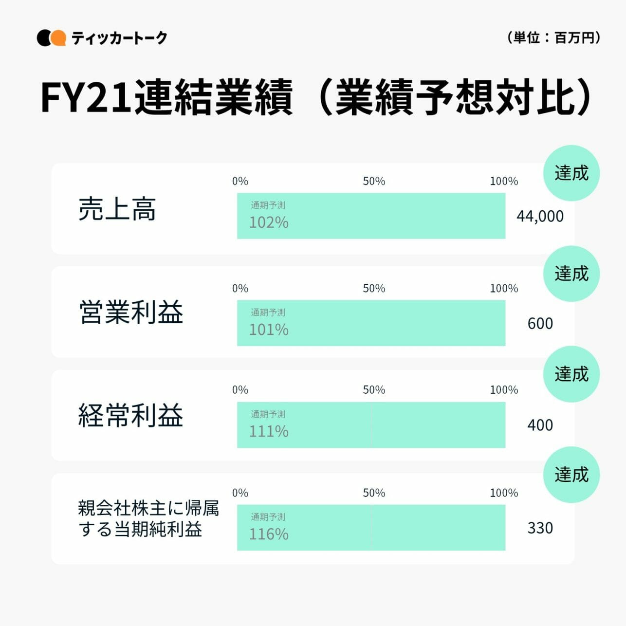 各事業が好調に推移した結果、全ての項目でFY21通期予想を上回る着地となっている。