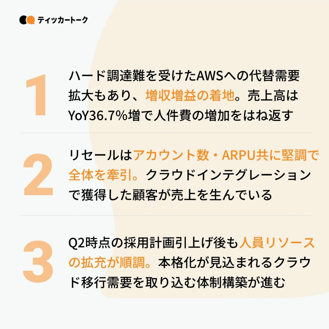 売上の約8割を占めるリセールにおいても、アカウント、ARPUともに順調に増加。クラウドインテグレーションを経てAWSへ移行した顧客によるクラウド活用が一段と進んでいると見られる。