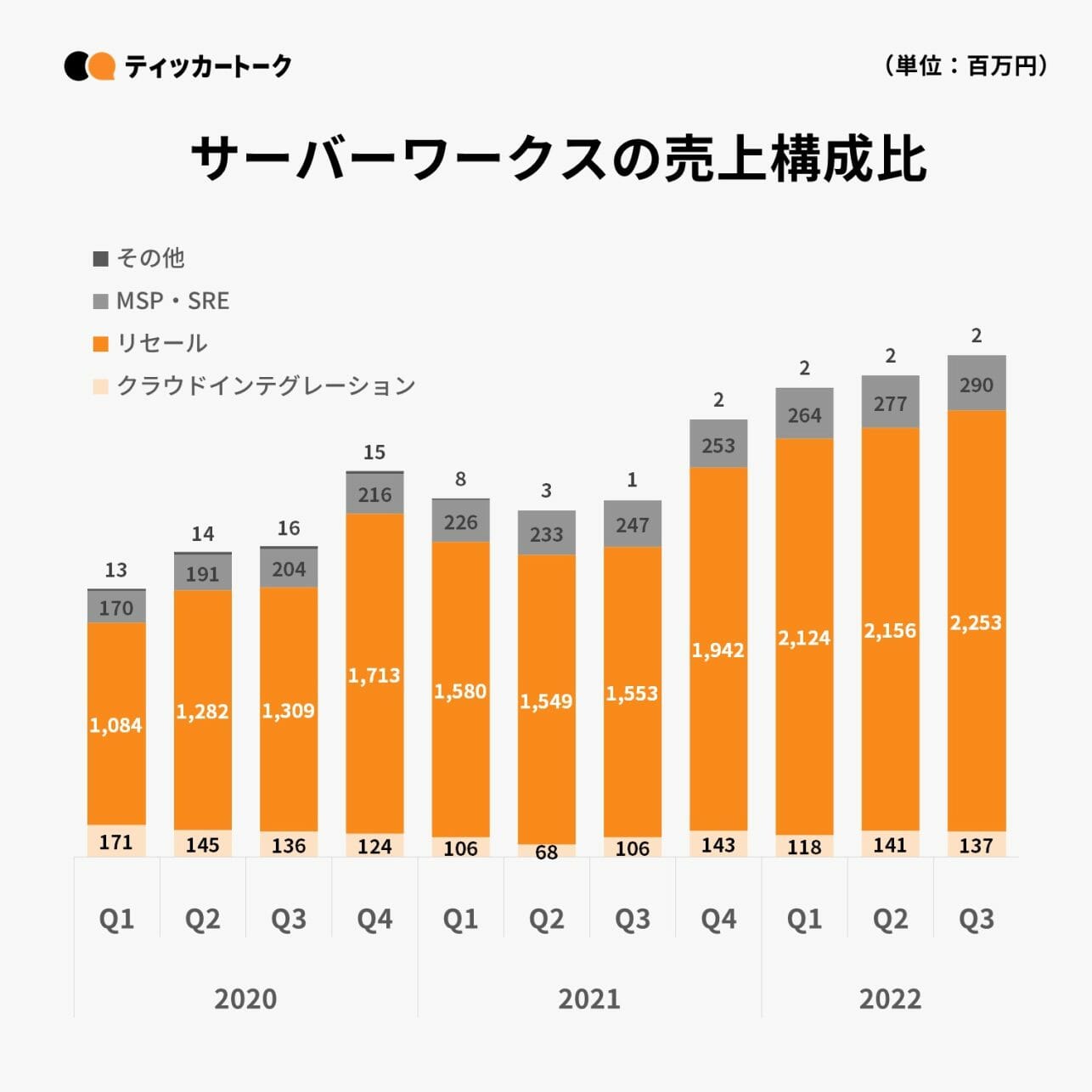 事業セグメント別に見ると、リセールがハード調達難を受けたAWSへの代替需要拡大から前期比1,851百万円増と全体の伸びを牽引。クラウドインテグレーション、MSP・SREもコロナ禍からの回復を背景に増収しており、3つの主要事業全てで増収となっている。